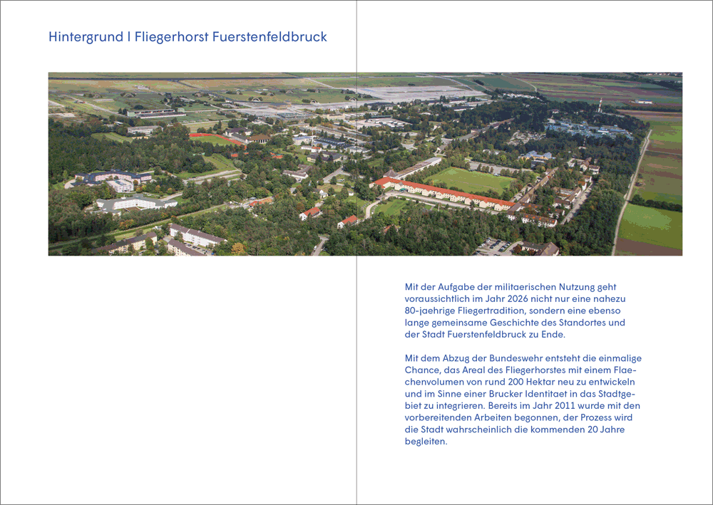 Nach dem Abzug der Bundeswehr soll auf dem Areal des Fliegerhorstes Fürstenfeldbruck ein neuer Stadtteil entwickelt werden. Für diesen Stadtteil wurde eine ganzheitliche Corporate Identity entwickelt.
