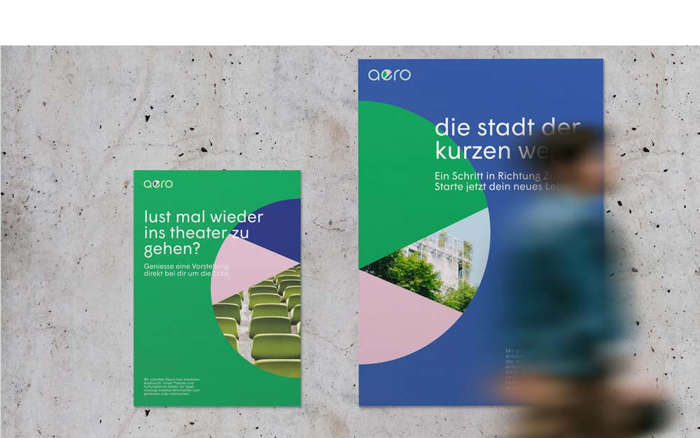 Durch das Design sollen Menschen für den Stadtteil aero begeistert und dazu bewegt werden dort nachhaltig zu leben. Mit prägnanten Gestaltungselementen wird auf die Stadt der Zukunft aufmerksam gemacht und das Erscheinungsbild für einen Ort zum Wohlfühlen geschaffen.