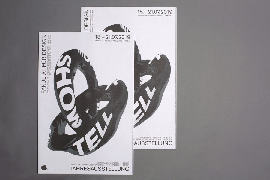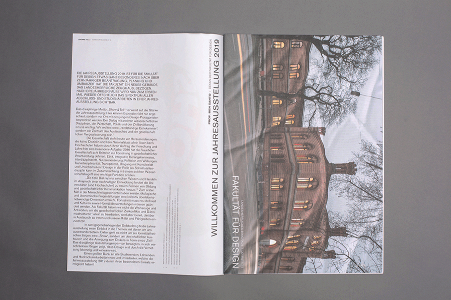 Der Katalog mit Zeitungscharakter ist im Rahmen der Jahresausstellung 2019 erschienen. Thema der Ausstellung der Fakultät für Design war "show+tell". Er beinhaltet allgemeine Infos sowie einen Überblick über alle Bachelor- und Masterarbeiten.
